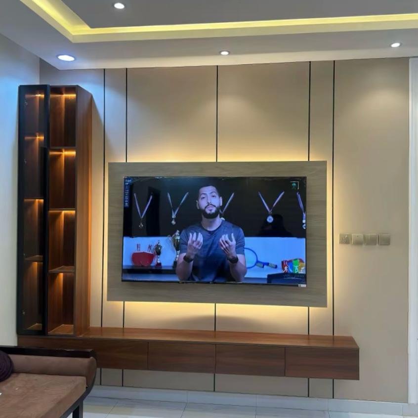 2. ​اختيار التصميم واللون: يقدم المعلم استشارات بناءً على الأثاث والإضاءة وذوق العميل لاختيار الأنسب، سواء كان ديكور خلفية تلفزيون ????، أو تكسية جدران كاملة.